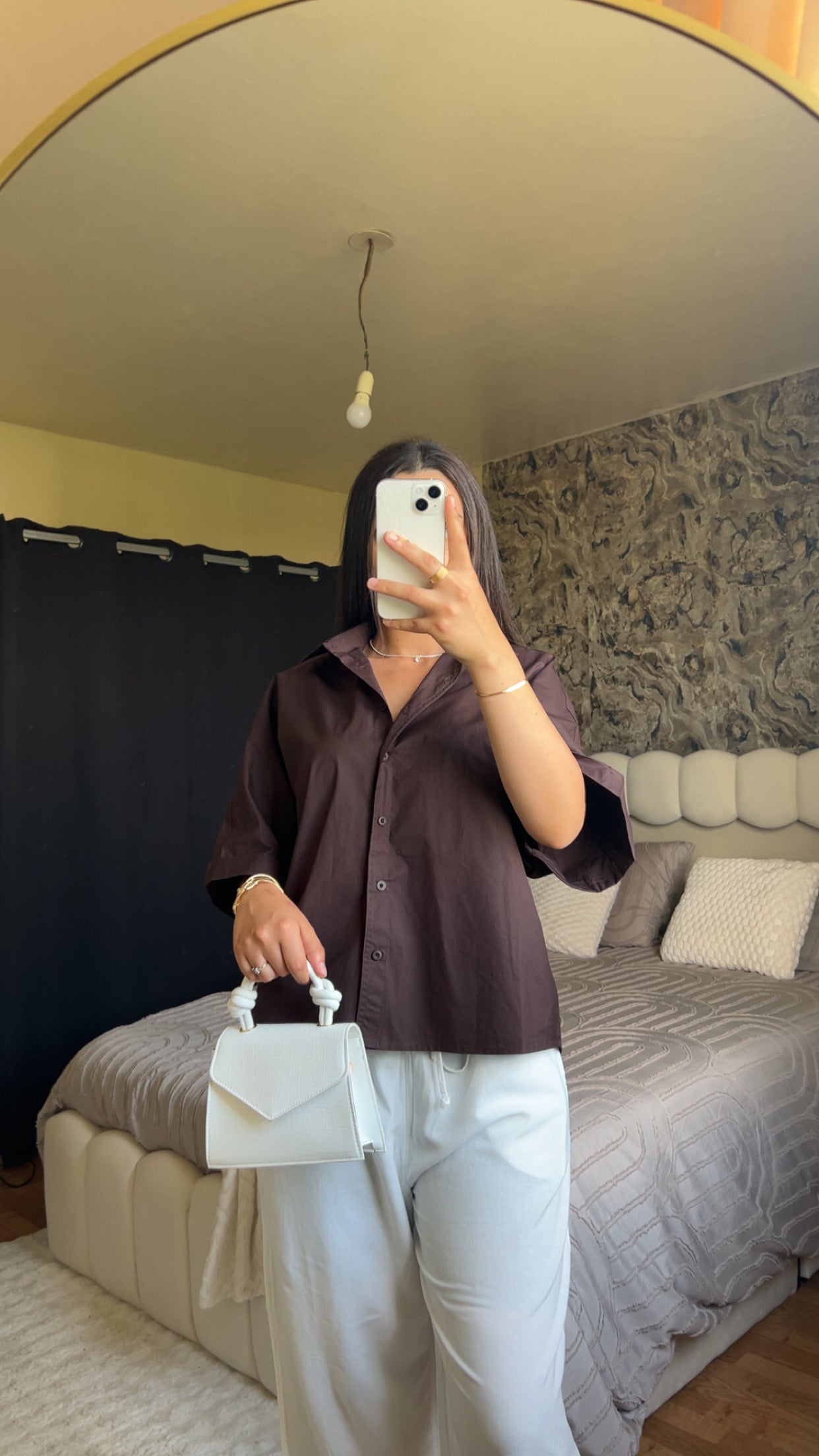 Coupe : ample oversize, manches mi-longues, fermeture boutonnée sur le devant, col classique