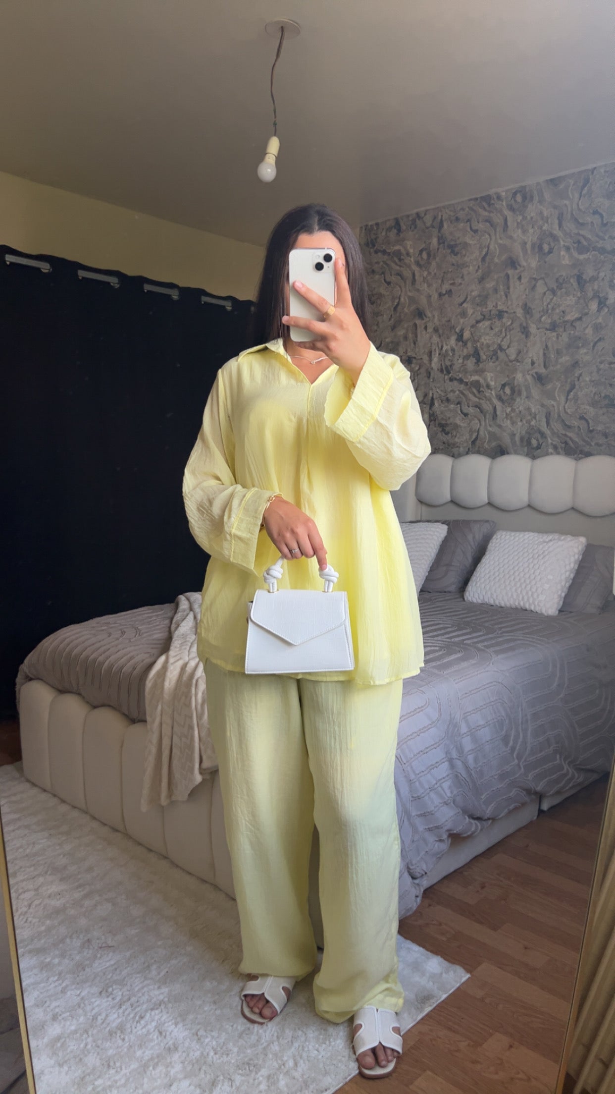 Coupe : ensemble léger ample et confortable, doublure haut et bas, pantalon droit taille élastique