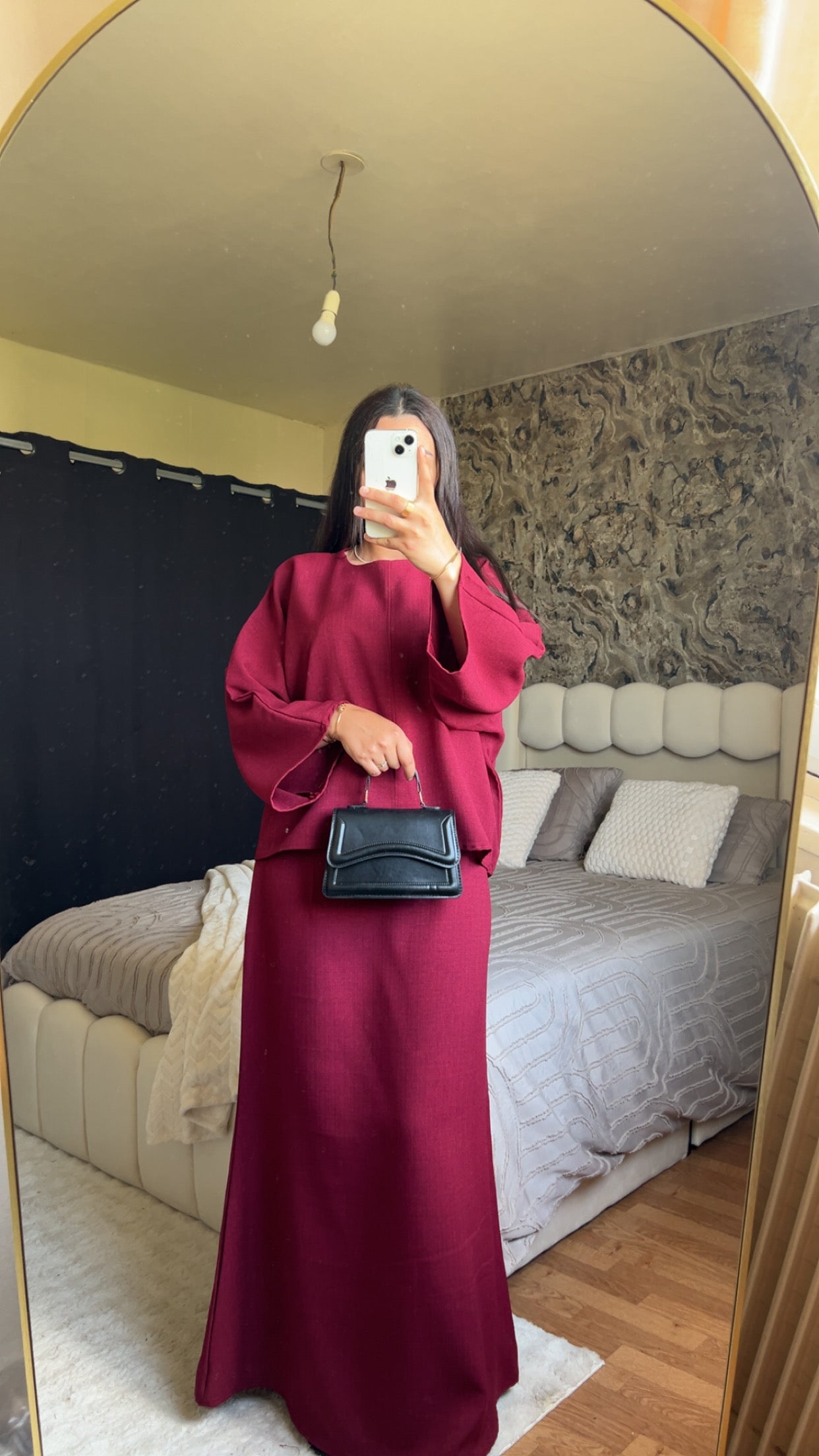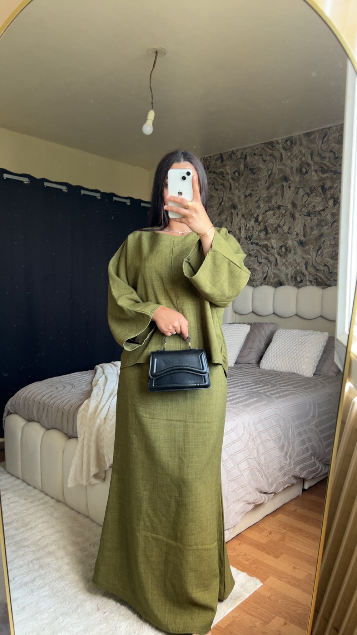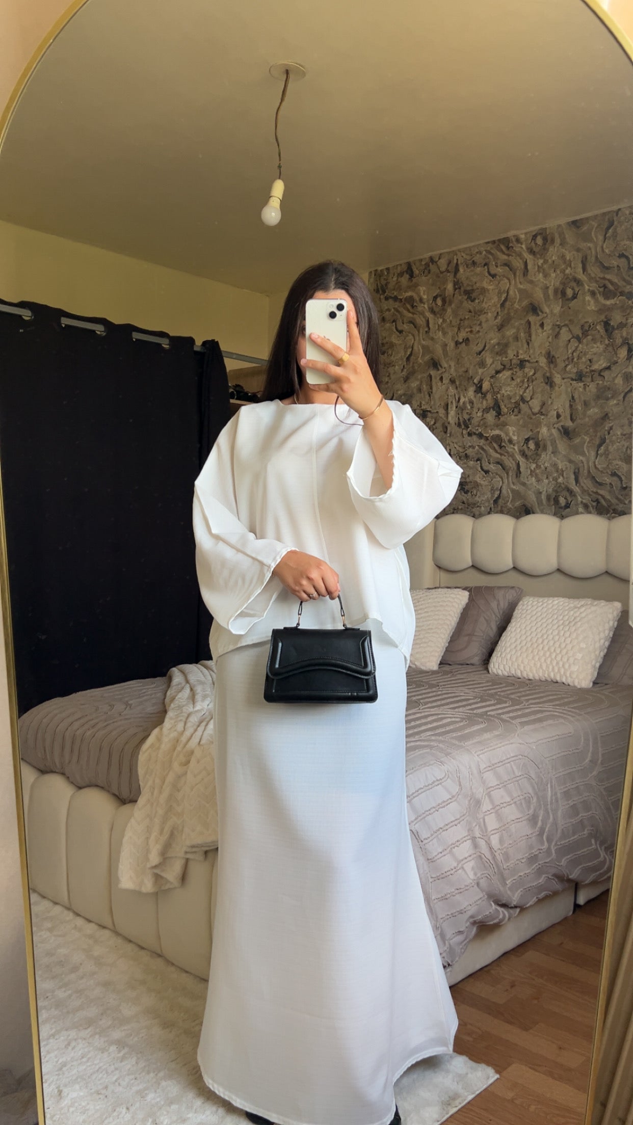 Coupe : ensemble composé d’un haut ample et d’une jupe longue coupe droite taille élastique, haut plus long à l’arrière couvre les fesses, manches longues
