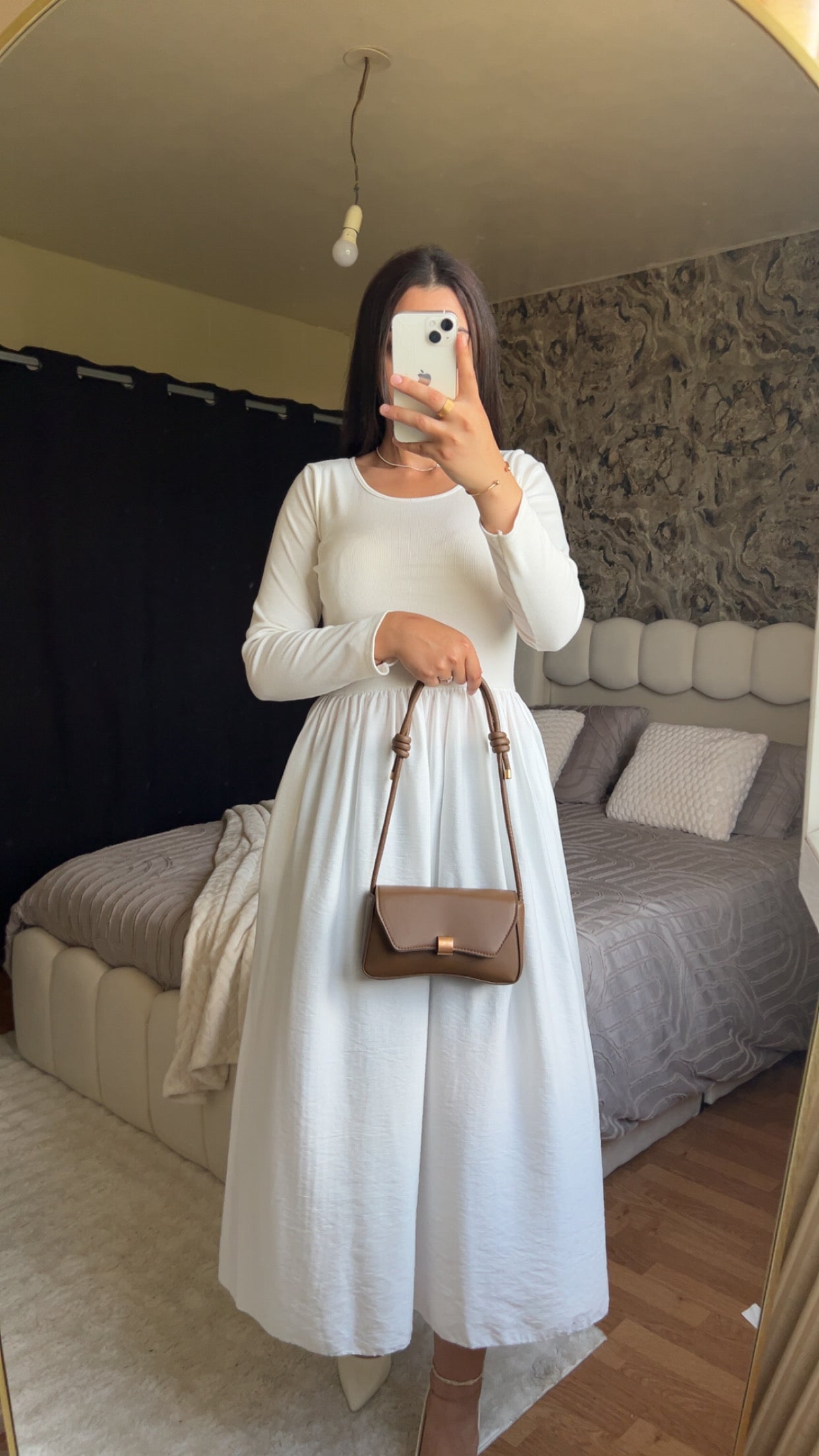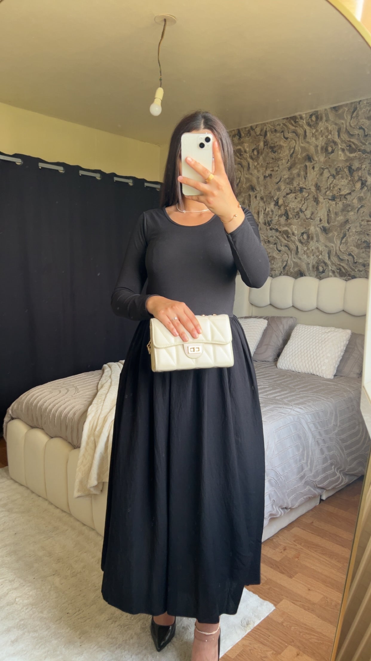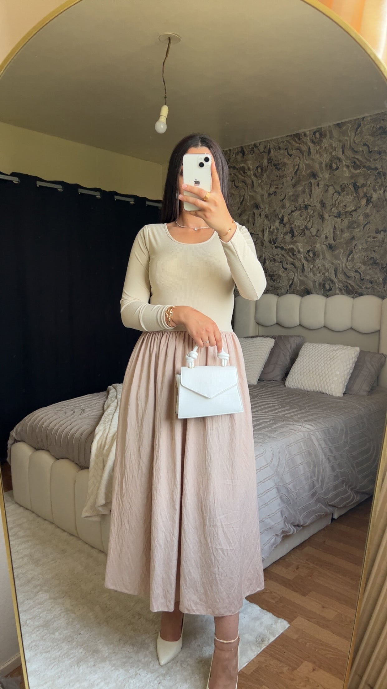Coupe : élégante et couvrante, style deux pièces effet robe unifié, jupe fluide et légère longueur mi-mollet, haut manche longue en tissu côtelé extensible