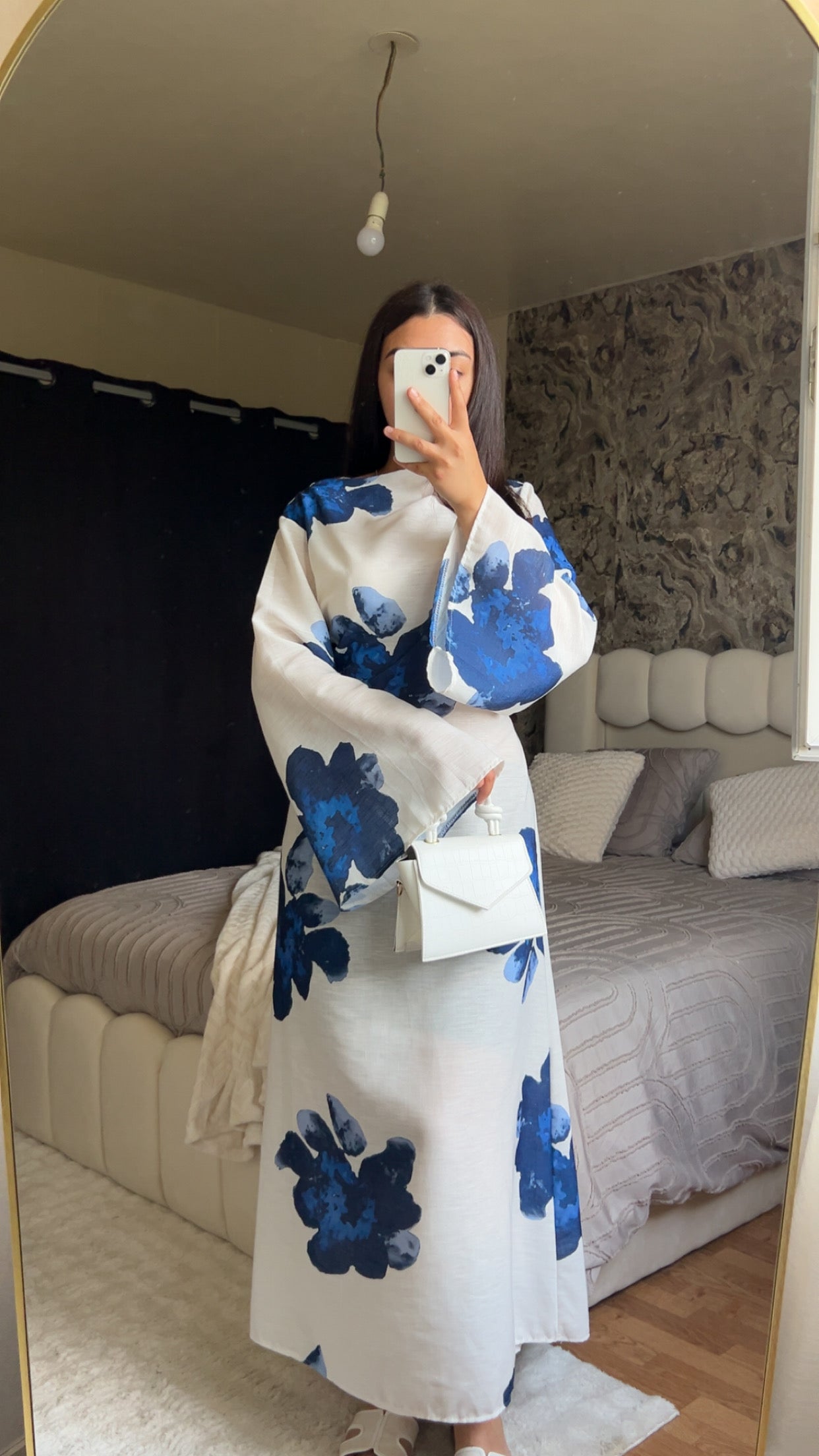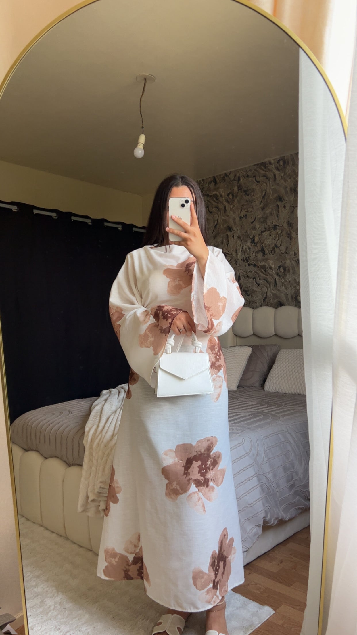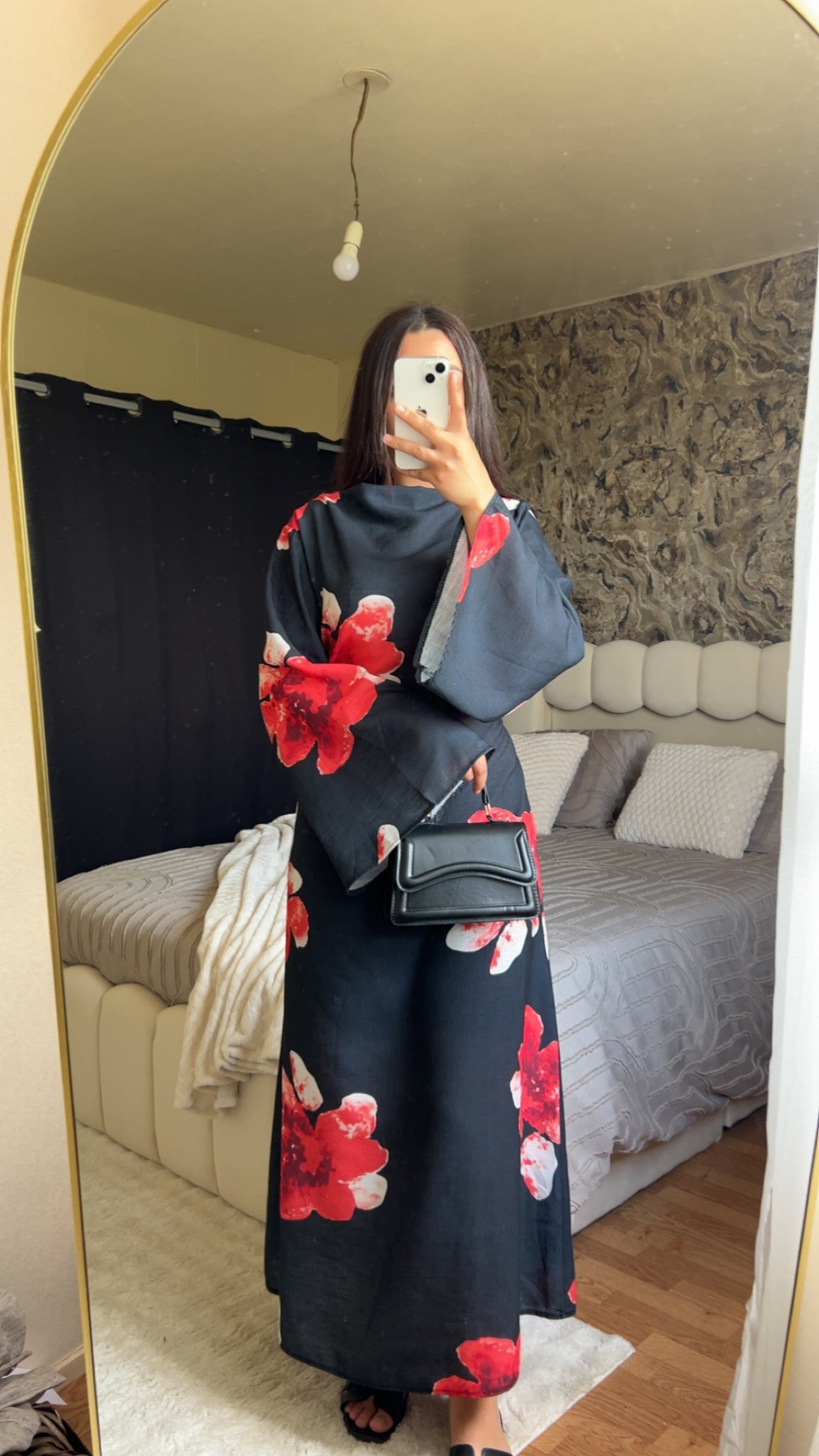 Coupe : ample et couvrante motifs floraux, ceinture à nouer pour ajuster la taille, haut style kimono avec manches larges